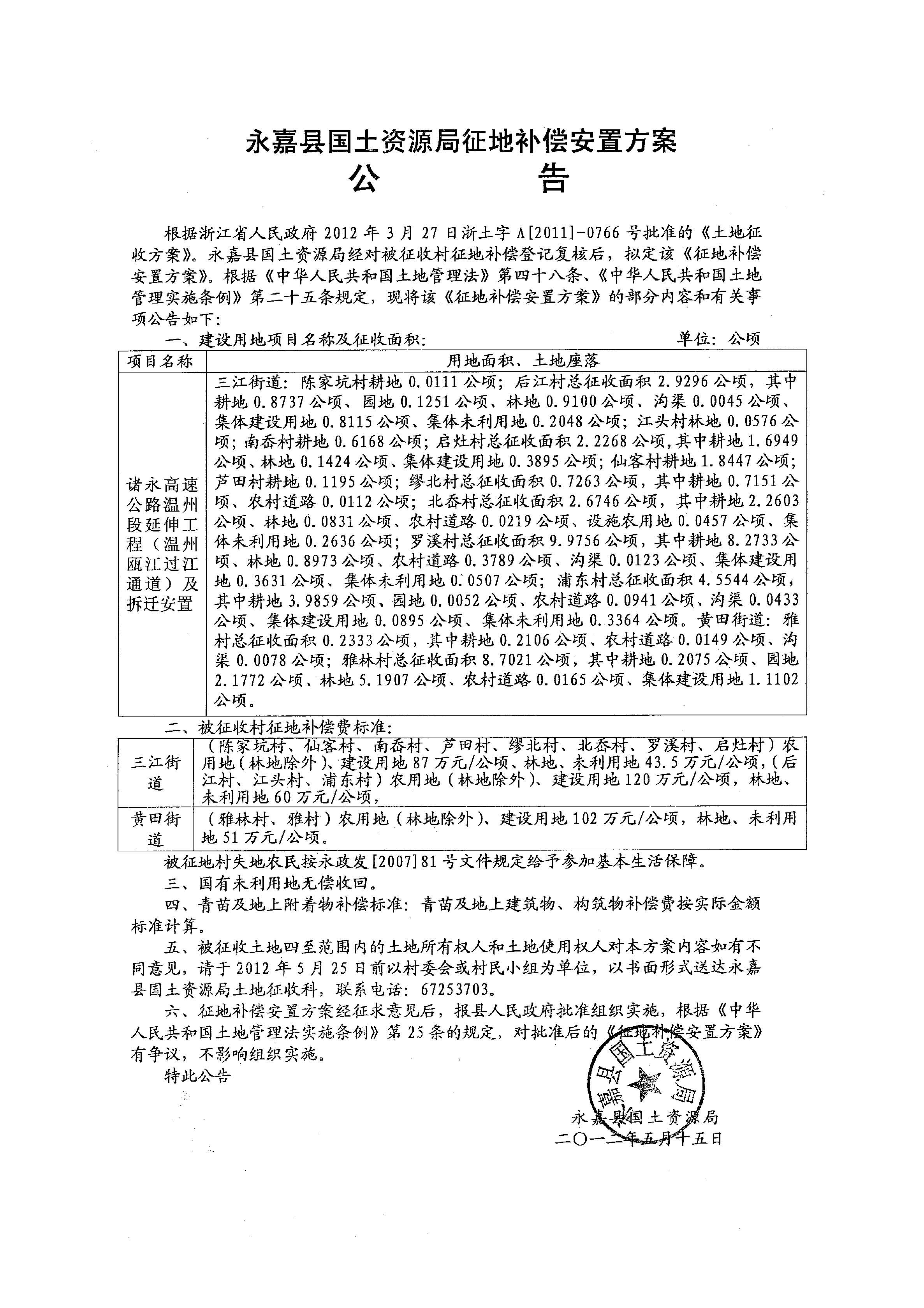 永嘉縣國(guó)土資源局征地補(bǔ)償安置方案公告