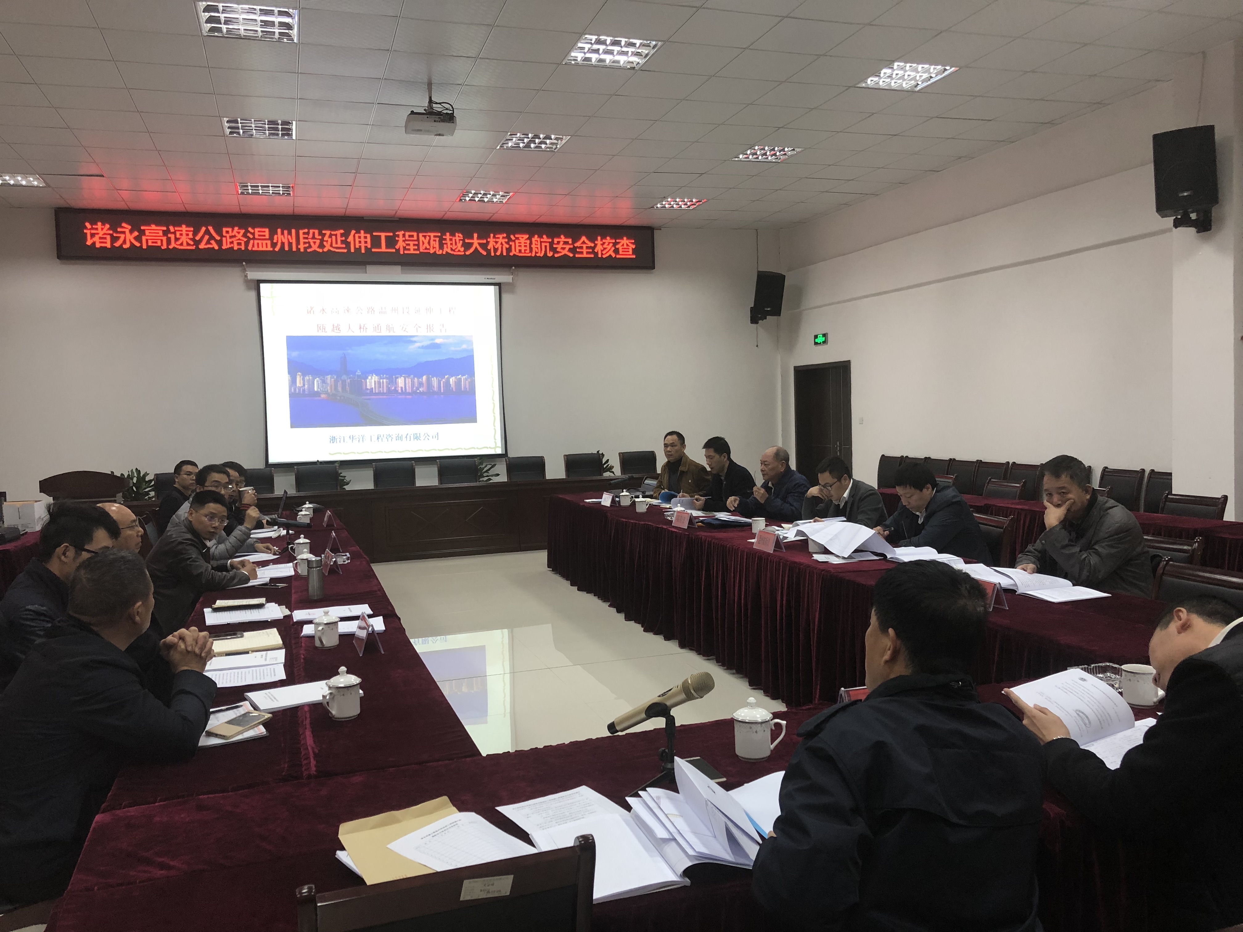 2017年11月23日下午,溫州海事局在通道公司二樓一號會議室召開了諸永高速公路溫州段延伸工程甌越大橋通航安全核查會,參加會議的有溫州市港航管理局、溫州航標處、溫州甌江通道建設有限公司、中交第一公路工程局、長江宜昌航道局勘測處、浙江華洋、會議邀請了5位專家組成了專家組。