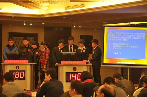 本次知識競賽以黨的十八大精神、黨史知識、國情世情等為主要內(nèi)容,分為必答題、搶答題和風(fēng)險(xiǎn)題三個(gè)部分,幫助答題者在作答時(shí)加深對黨的“十八大”精神的了解,同時(shí)更好地促進(jìn)彼此的友誼和團(tuán)隊(duì)合作精神。競賽中,選手們準(zhǔn)備充足、反應(yīng)敏捷、答題踴躍、準(zhǔn)確率高,較強(qiáng)的競爭性和對抗性將比賽一次次推向高潮。每輪比賽間歇期間,主持人為在場觀眾準(zhǔn)備觀眾題,在舉手觀眾中隨機(jī)抽選作答。經(jīng)過角逐,中交一公局諸永高速公路溫州段延伸工程項(xiàng)目部獲得競賽第一名。