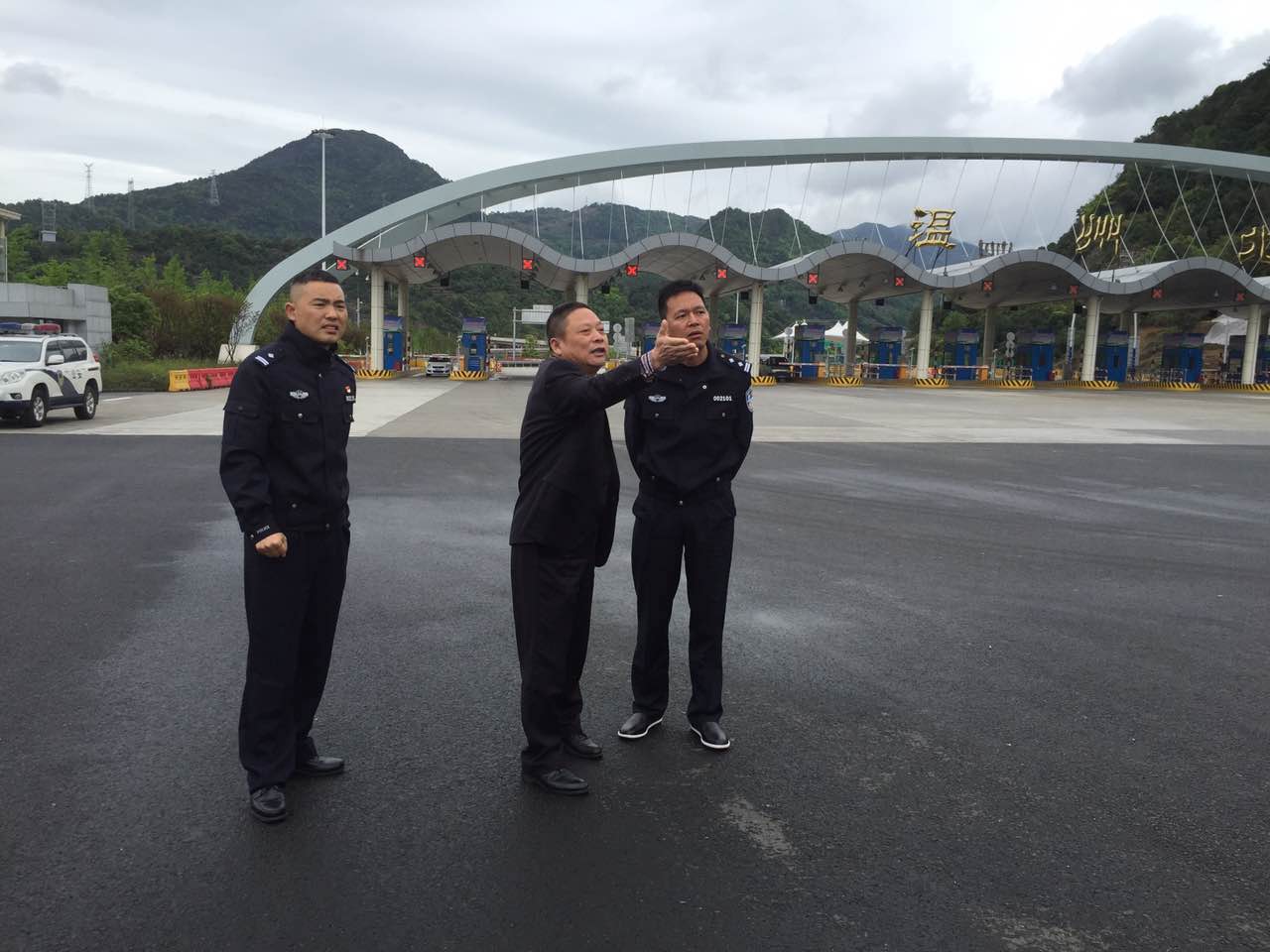 為確保G20峰會安保工作順利進行, 4月18日上午高速交警溫州支隊王辛微大隊長一行4人蒞臨溫州北收費站在對溫州北收費站公安檢查基站進行選址。通道公司常務(wù)副總經(jīng)理朱清福等陪同。
